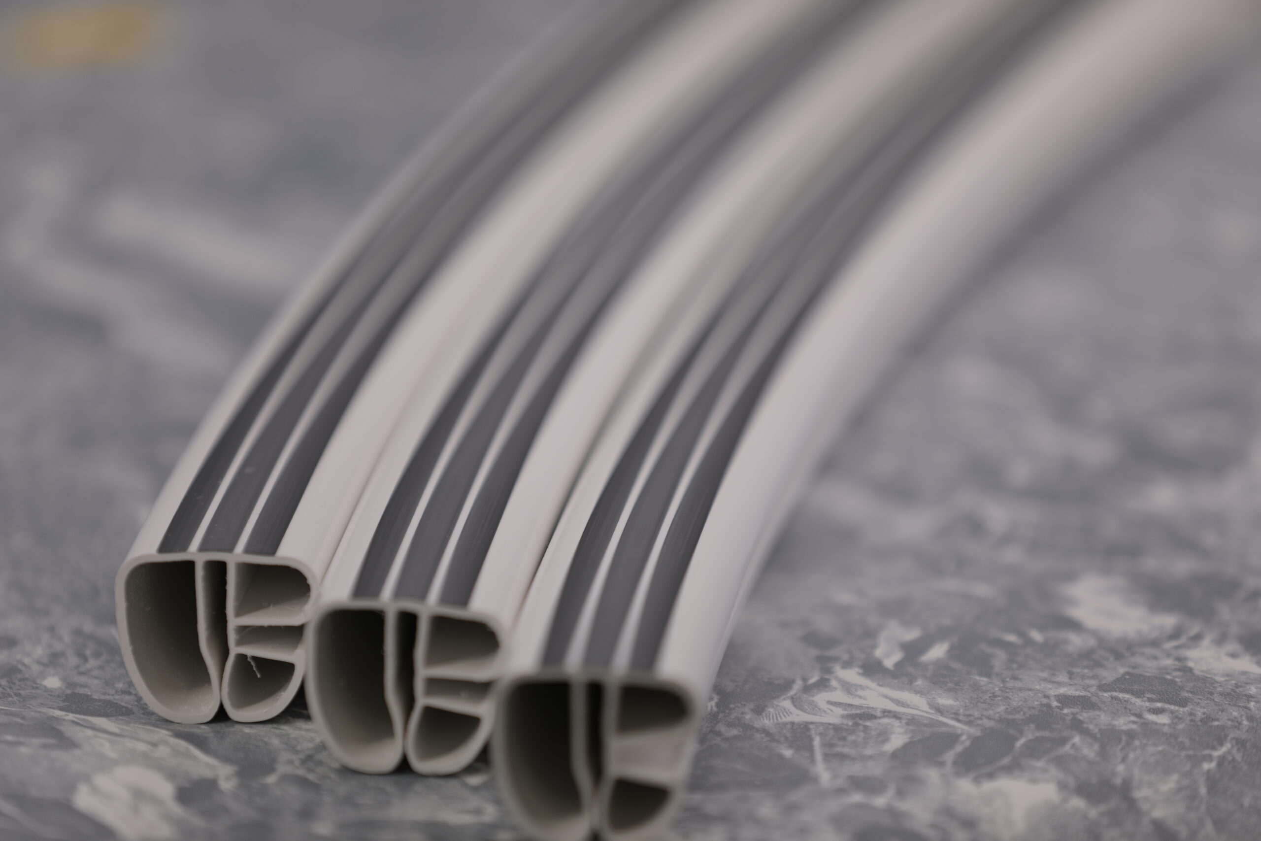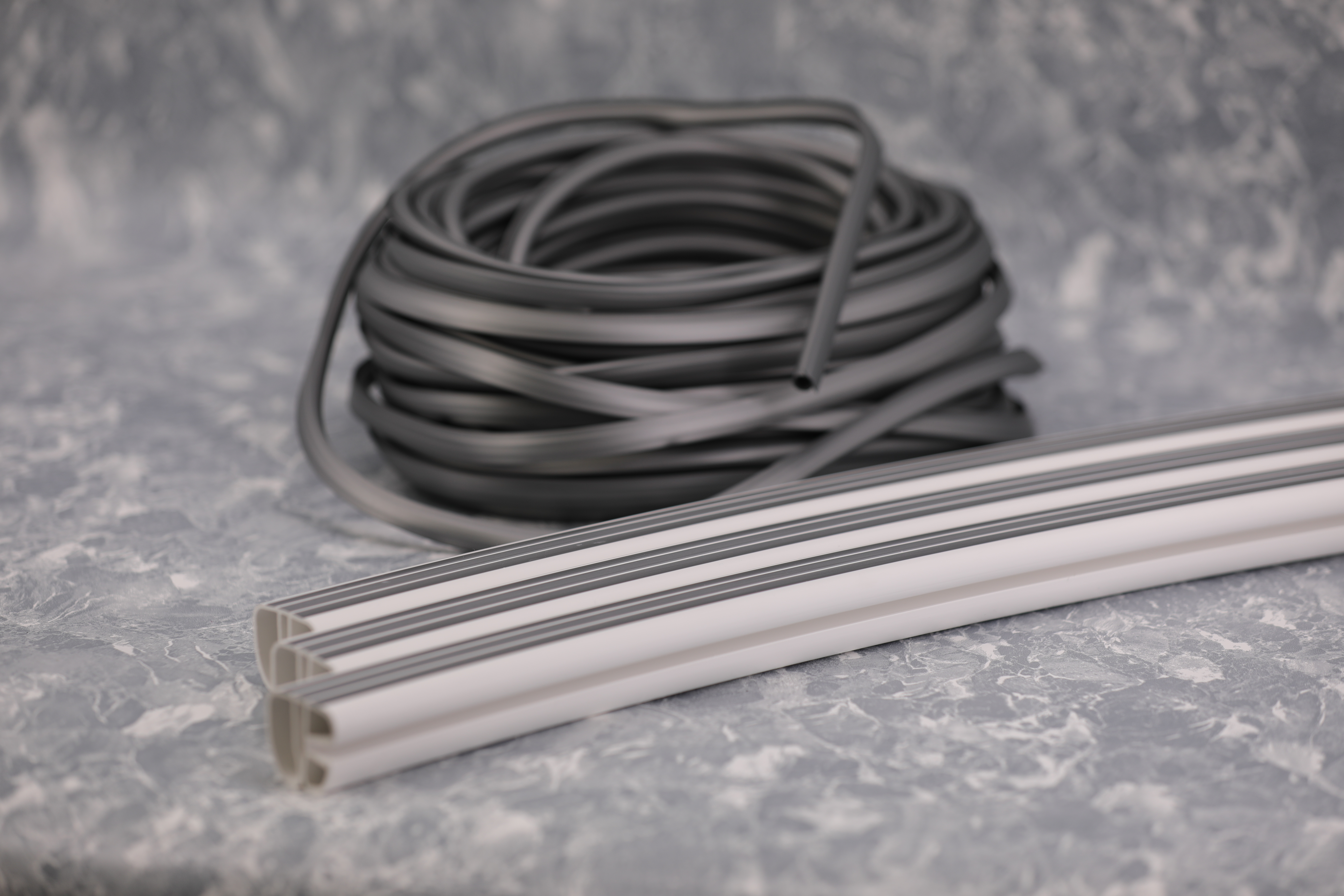 Der aus Kunststoff bestehende Kombi-Handlauf in weiß hat die Möglichkeit, sowohl Folien mit einer Einhängebiese und einer Keilbiese zu fixieren.