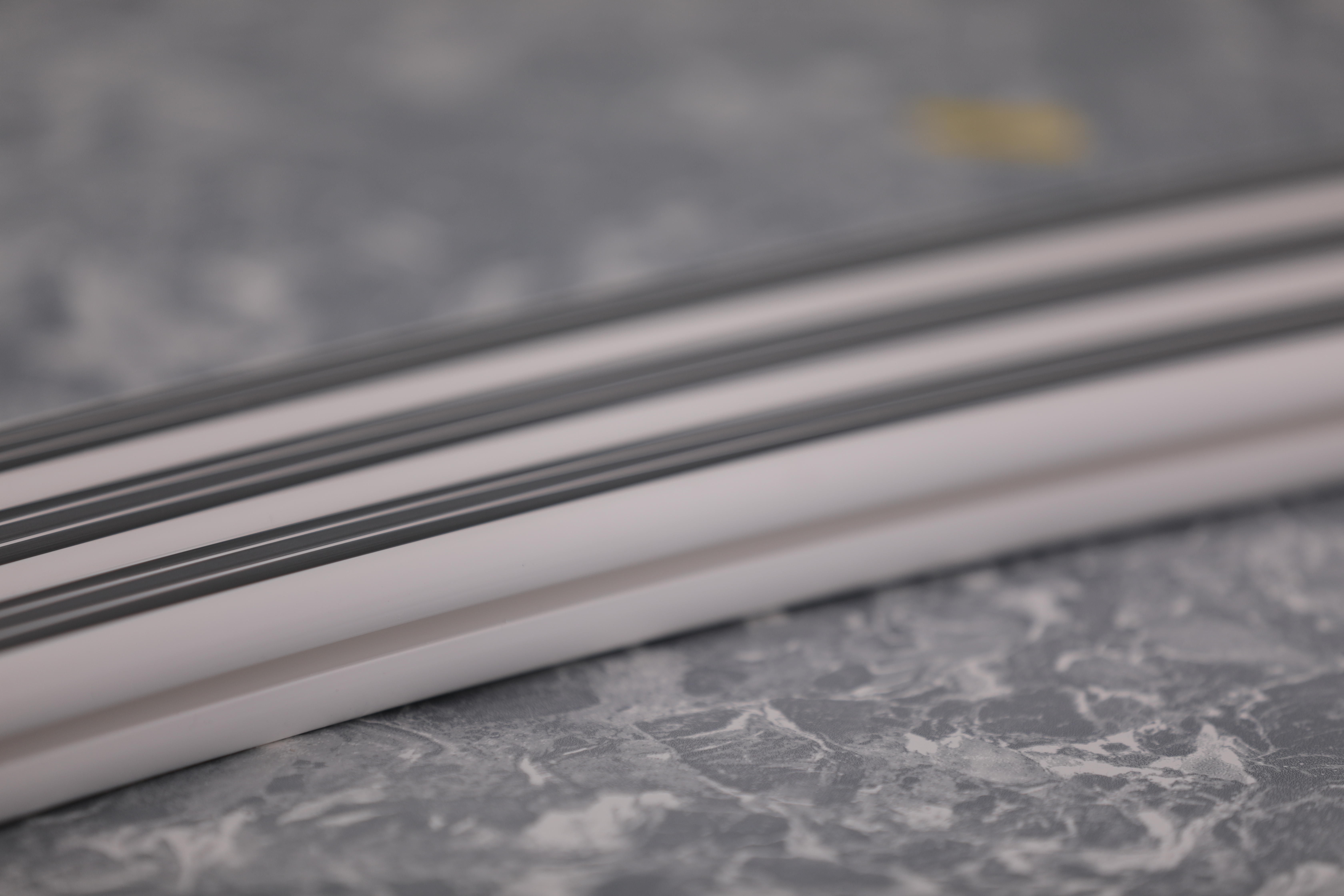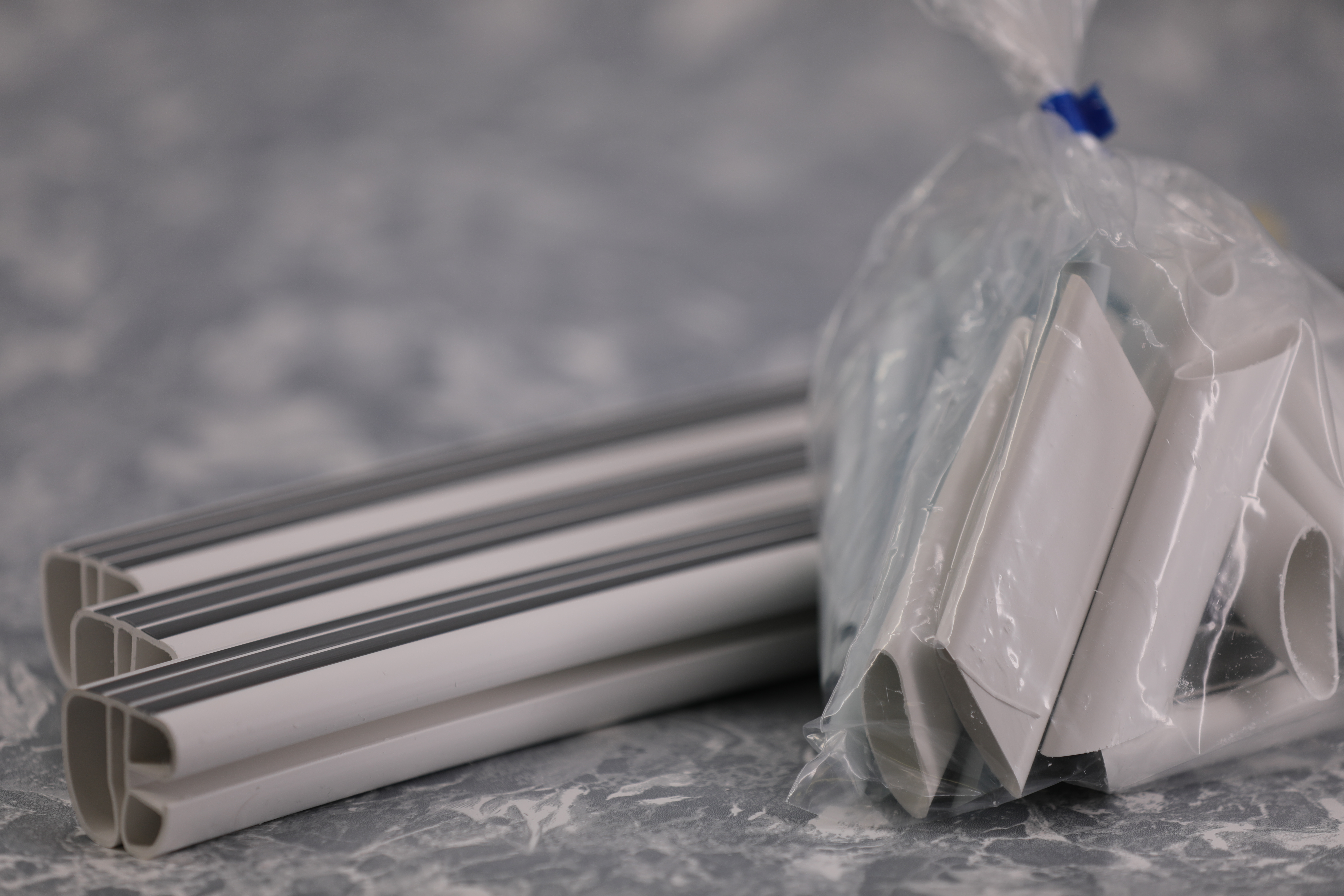 Der aus Kunststoff bestehende Kombi-Handlauf in weiß hat die Möglichkeit, sowohl Folien mit einer Einhängebiese und einer Keilbiese zu fixieren. Durch die mitgelieferte Verschlussbiese wird verhindert,
